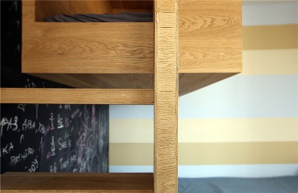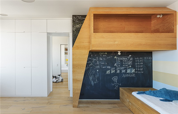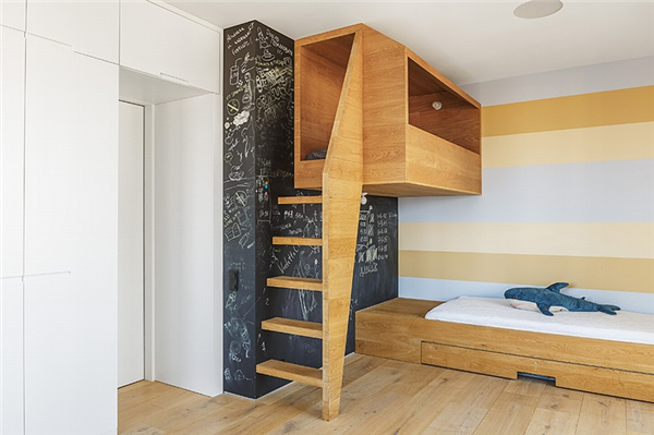 当设计师得知家里有三个孩子时,于是在其中一个男孩的卧室打造了一个木盒子“鸟巢”,孩子们可以通过黑板一侧的梯子爬进去作为一处很好的庇护所。