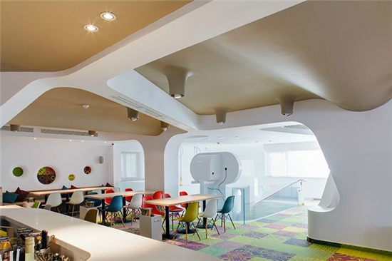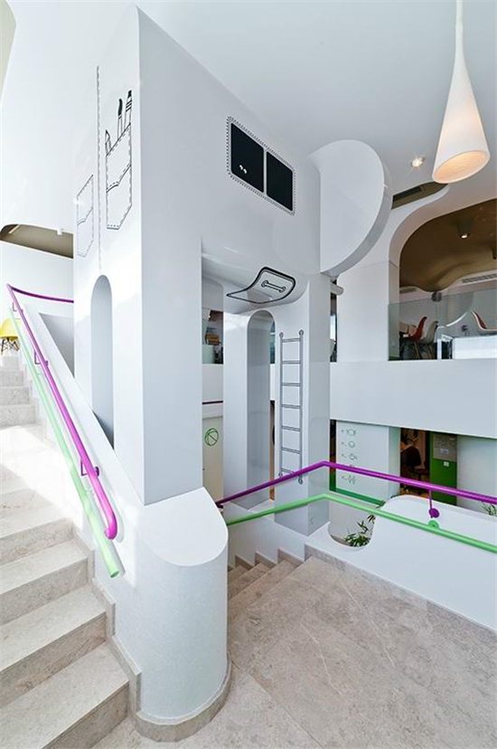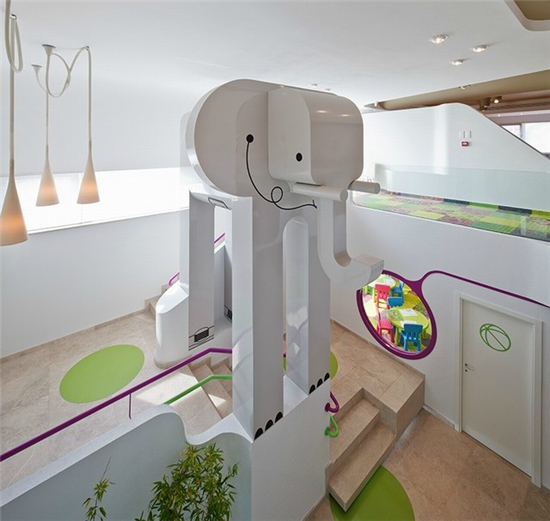 他们便可在一座4米高可爱的大象模型旁的餐厅进餐。大象跨在主要楼梯的中央,仿佛在用身上画着的MP3播放器中欣赏音乐。