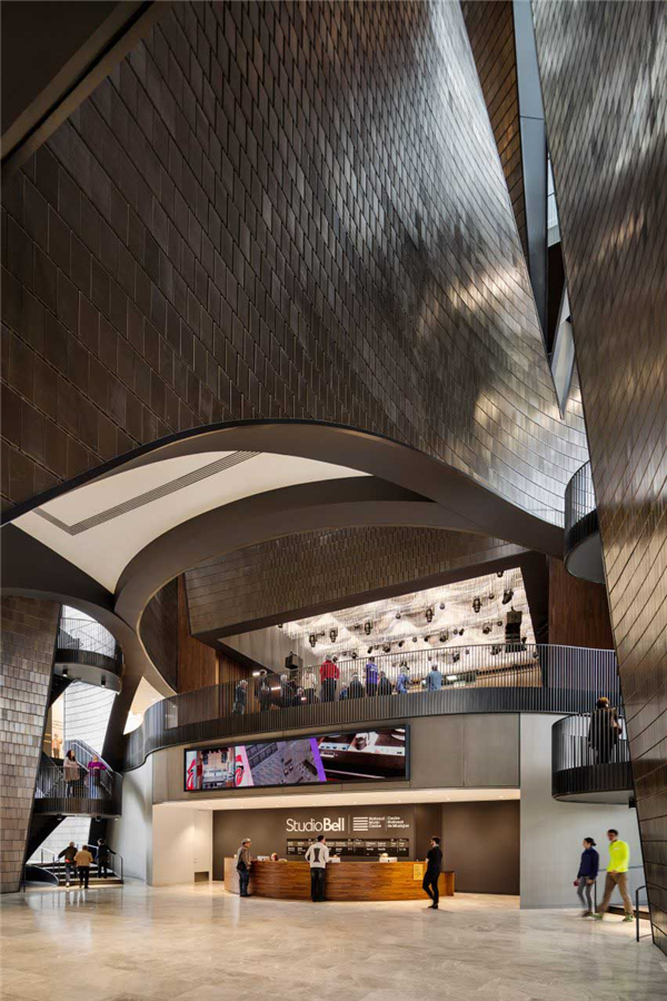 在纽约和俄勒冈(Oregon)设有办公室的Allied Works Architecture的创始人Brad Cloepfil说,“我们试图在设计中创造出变换的空间。Studio Bell的九座楼模仿重力和传声效果而建,共同创建出能发出音乐和光芒的沉静而具力量的乐器。”场地内的原有砖石建筑,爱德华王酒店(King Edward Hotel)曾是传奇蓝调俱乐部的发源地。