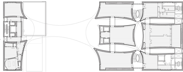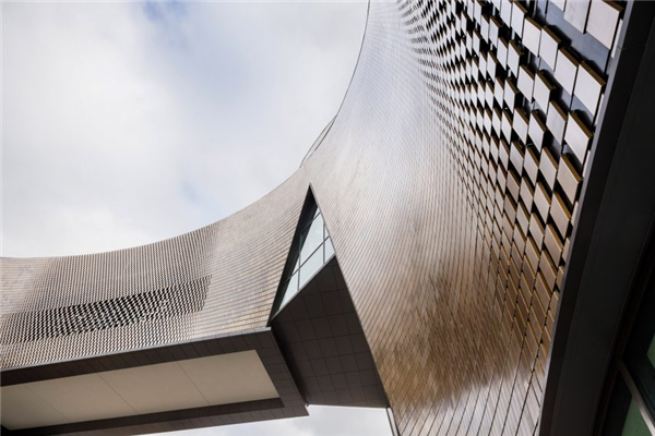 釉面陶瓷砖包裹下的建筑,是由两座高楼以穿过街道的天桥为连结构成的。以乐器形状为创作灵感的几面曲面墙和具造型感的开口,是建筑外形的重要特征。