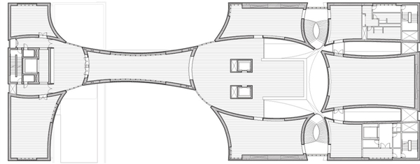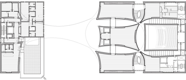 天桥将历史建筑与音乐中心新建部分连接起来。游客走入东侧建筑,进入到两侧设置了螺旋楼梯的中央大厅。