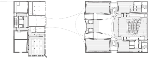 二层设有主要演出厅,可俯瞰大厅并“作为建筑的中心空间的结构中心”。有灵活的座椅和可移动的隔音墙,音乐厅可以为小型演出缩小空间,也可以往外延伸,用音乐声将大厅和交通空间填满。