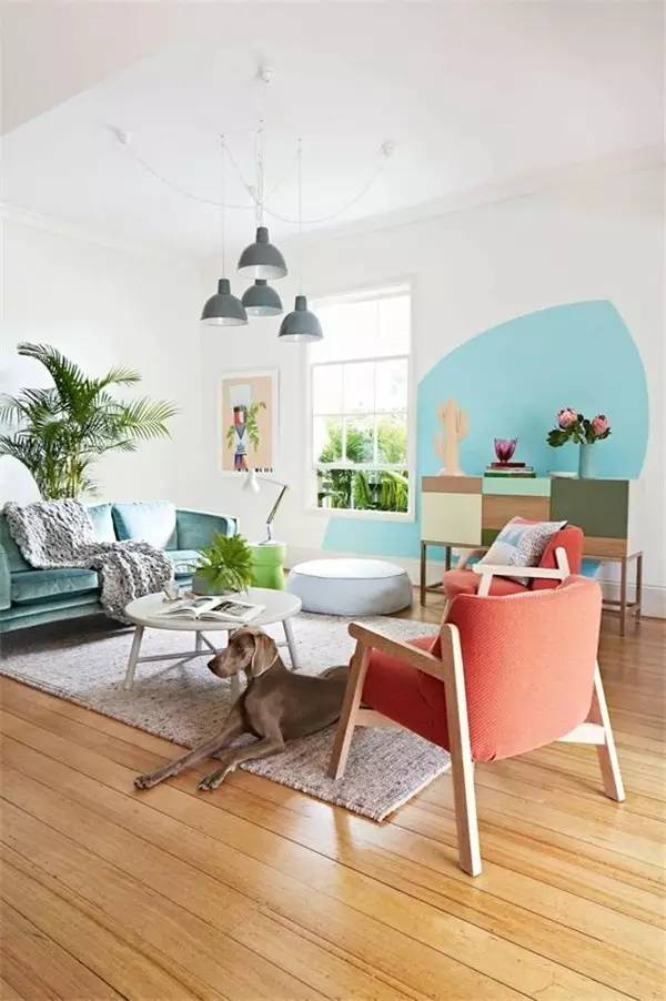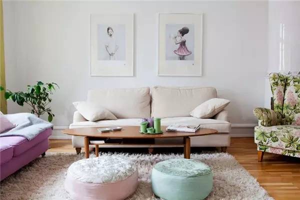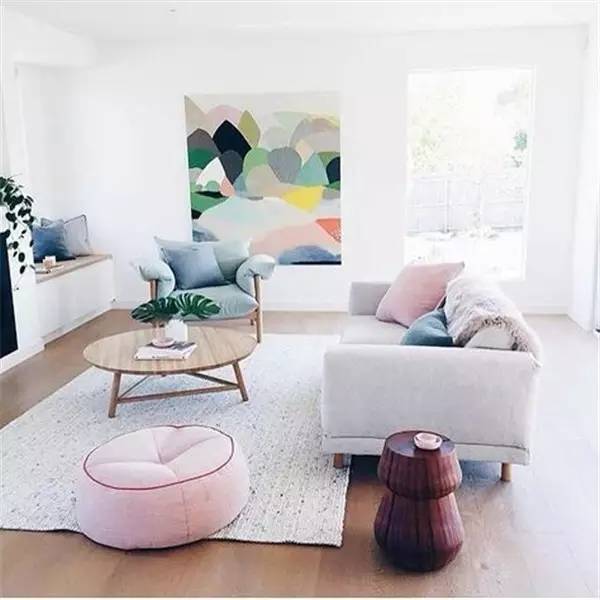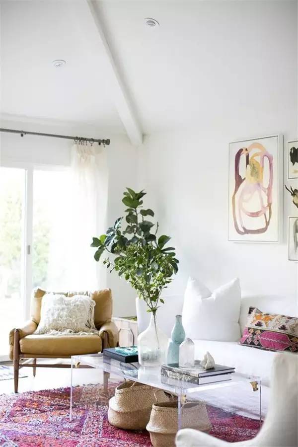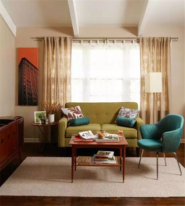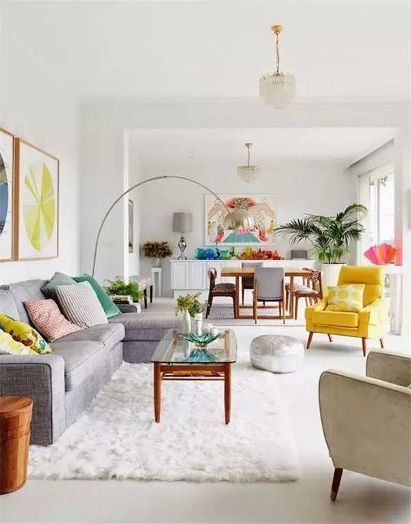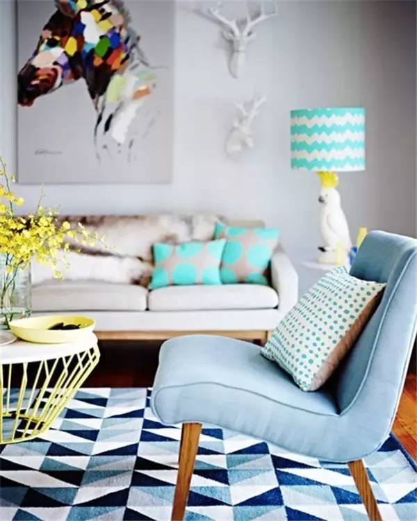 ▲墙面、窗帘、地毯、双人沙发,清一色的素色系。点缀亮眼的单人沙发和抱枕,让整个空间变得灵动、跳跃。