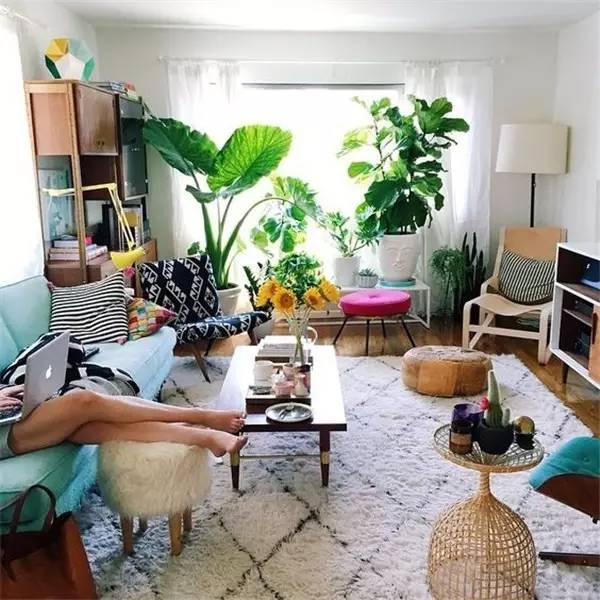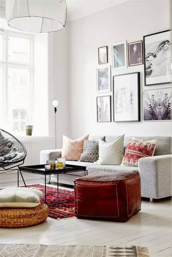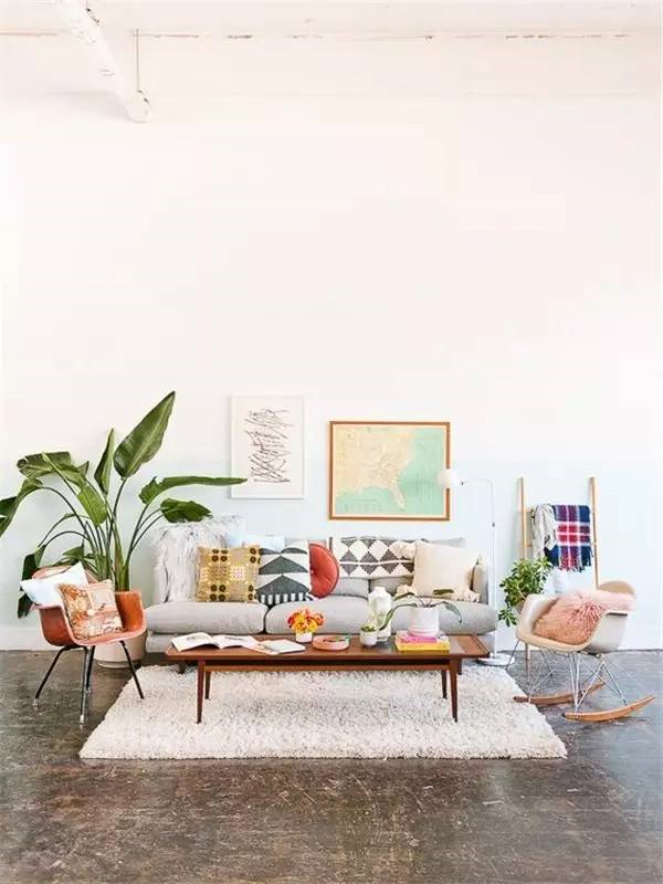 ▲普普通通的大白墙、布沙发,不免显得乏味,一架秋千尽显趣味,搭配一把摇椅,慵懒惬意。