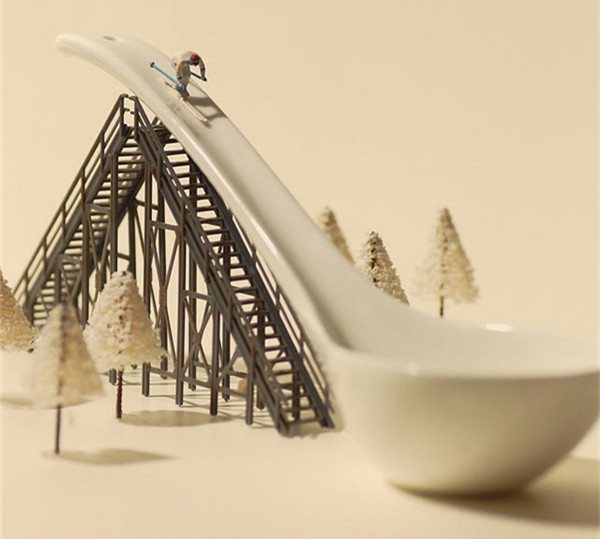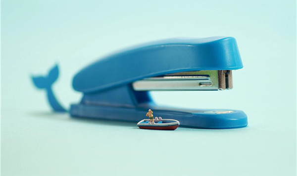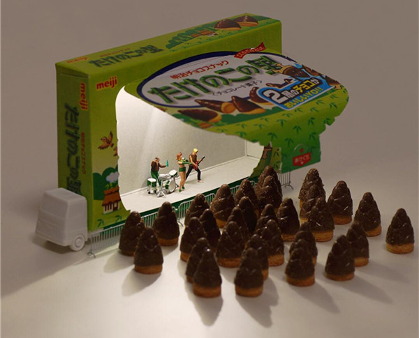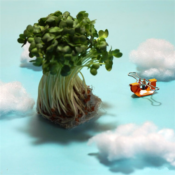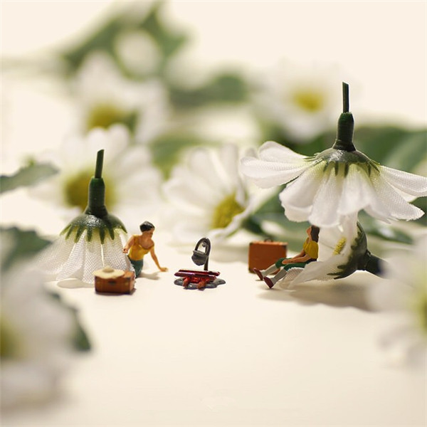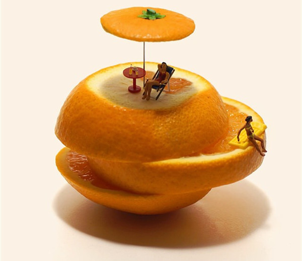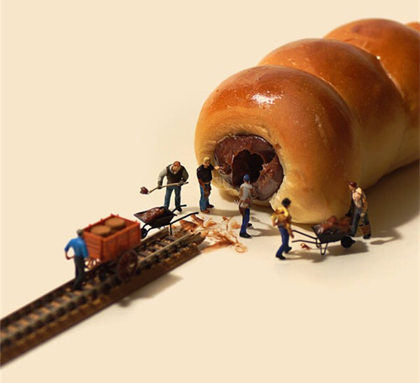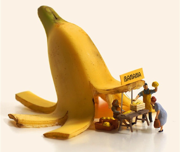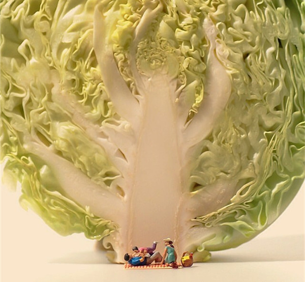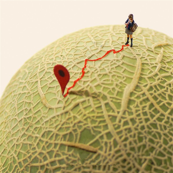 Tanaka Tatsuya从很早就开始每天拍摄一张微型照片,而且全部是以日常生活的常见物品为主角,在他的镜头中,再平常不过的手机、唱片、饼干、水果。蔬菜等都小巧入镜,巧妙的构图和创意的摄影赋予了这些平常小物更生动的生命。照片中的小人们就好像是我们自己,在烦闷的生活中,缩小自己,放大身边的寻常小物,更添生活的情趣和快乐。