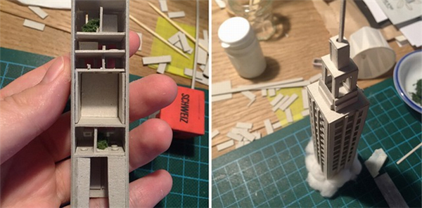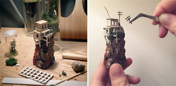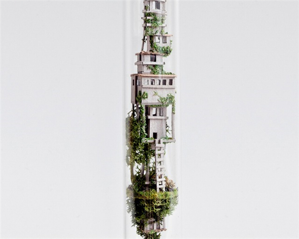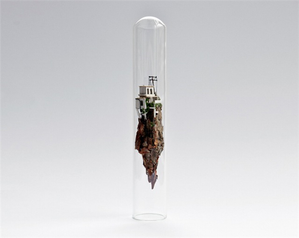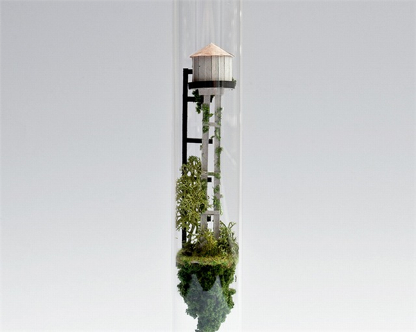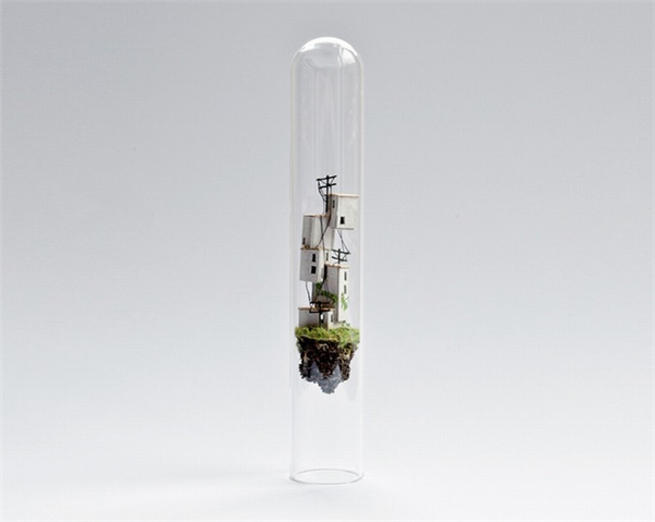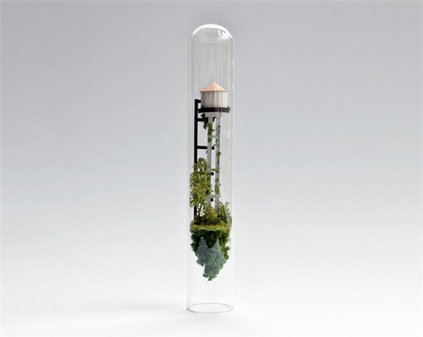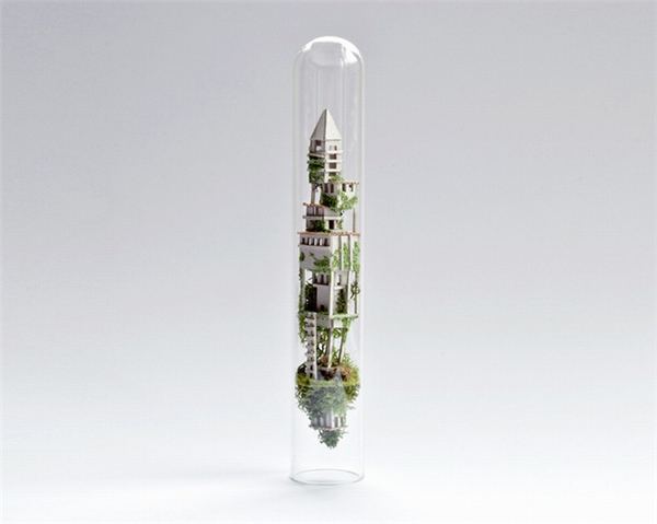 来自阿姆斯特丹的设计师Rosa De Jong创作了一系列封装在试管中的微缩建筑模型。这些微缩的瘦长的房子由卡纸、树皮、苔藓等材料制成,建筑有着独特的结构形态,好像科幻电影中那些离奇的房子。模型制作非常的精致,你甚至可以看到到爬梯、电线杆等细小的构筑物。每个模型自成一个世界,有着自身的土壤、植被等小环境。