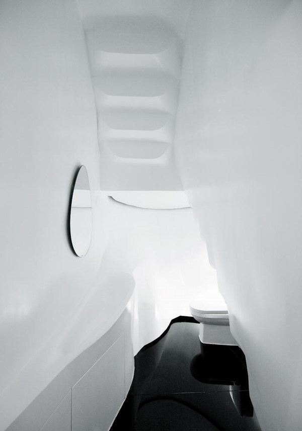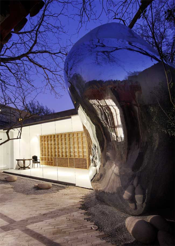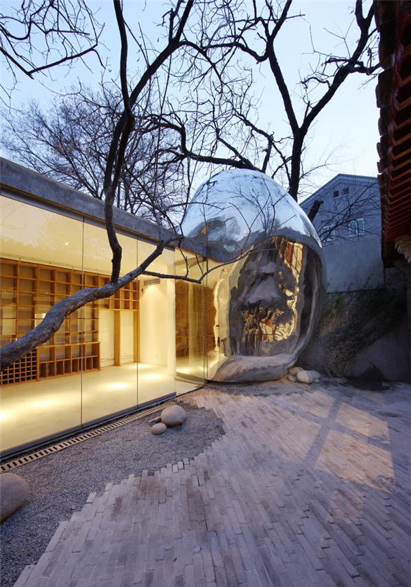 出人意料的是,这种微观乌托邦的理想,在展览的三年之后便开始出现在了北京的四合院里。第一个<32号泡泡>是一个加建的卫生间和通向屋顶平台的楼梯,它看上去仿佛是一个来自外太空的小生命体,光滑的金属曲面折射着院子里