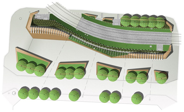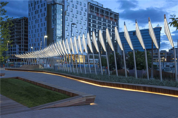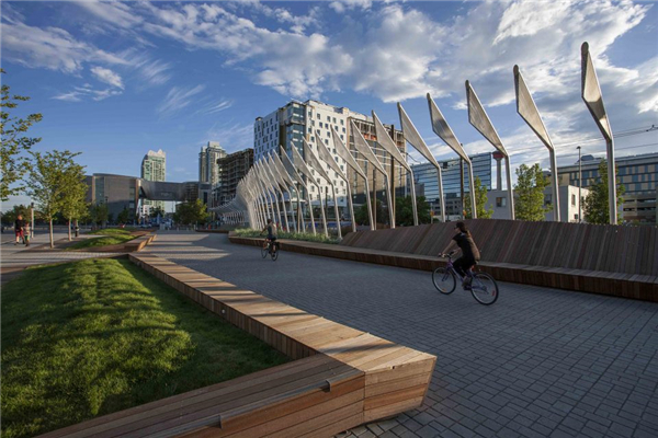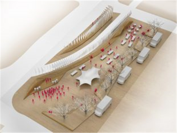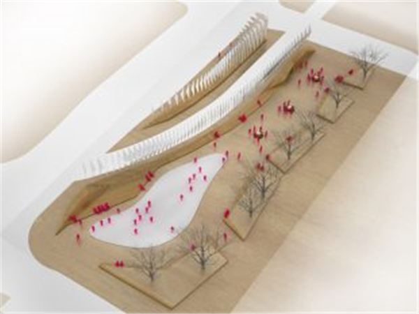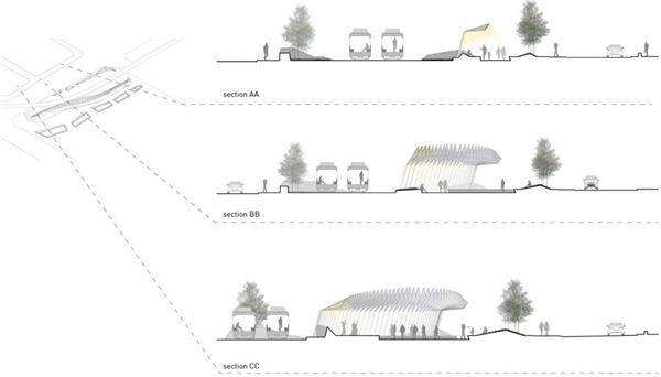 第二种调解方式是创建一个连续的平面,将整个场地缝合在一起,同时将其转变为一个适合各种户外活动的空间。广场由轻轨划分场地后剩余的空间组成,轻轨线东侧沿着轨道的边缘地面折叠成一道浅浅的轴线。在广场的东侧形成一系列可以让游人进入公共空间的场所,边缘的人群柔化了区域的景观,包括场地中的树木形成的遮阴,与对面的一系列穿孔铝板定义的空间形成了对比。