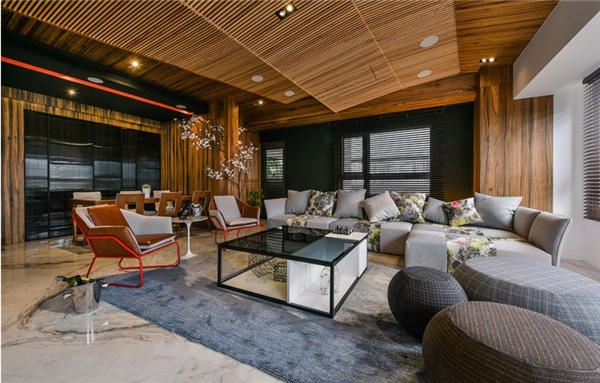 ▲天花板以实木格栅做包覆,藉由高底起伏的立体造型,创造视觉趣味性,且成功隐藏梁线位置。