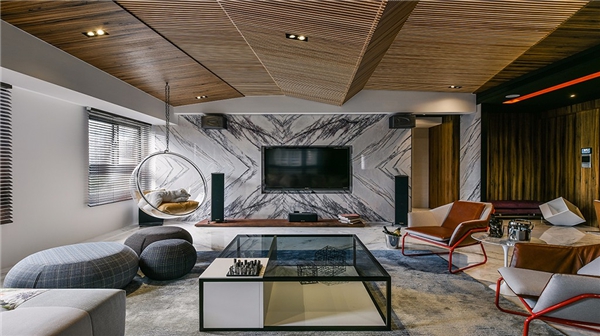 ▲电视墙与地坪藉由大理石铺陈,天花与壁面则利用木质元素平衡空间暖度。