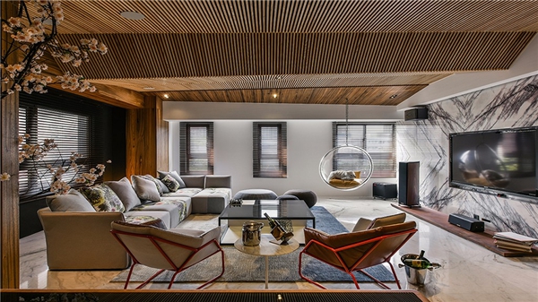 实木格栅布满整片天花,高低起伏的线条构织出立体造型,隐藏起梁线所在,且带来视觉趣味性;以大理石材为底的地坪与电视主墙,更在温润木色的加温之下,平衡其冷冽的质感调性,调和出舒适宜人的场域温度。