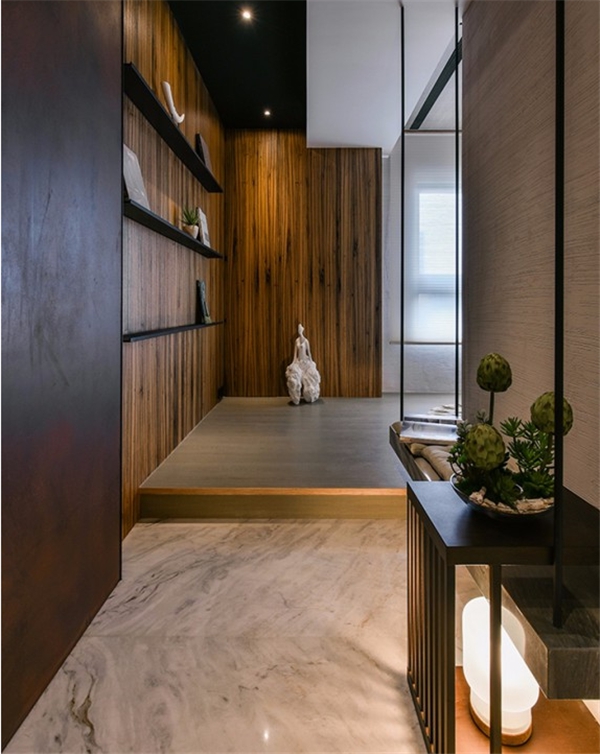 ▲通往私领域的廊道,右侧墙面以珪藻土做铺陈,结合灯光与摆设的安排,营造自然朴质的情境氛围。