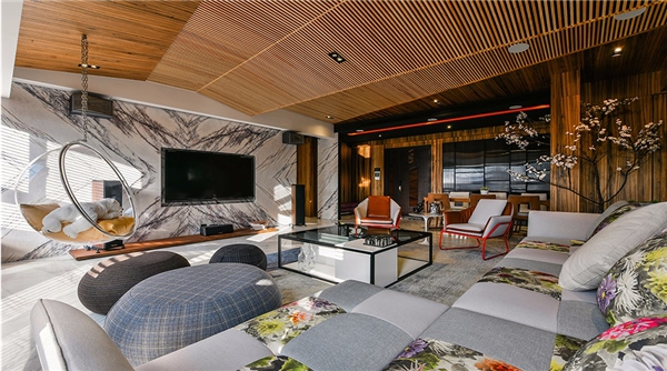 ▲创研俬.集设计选用大理石作为电视墙体,衬托出恢弘大器的场域气势。