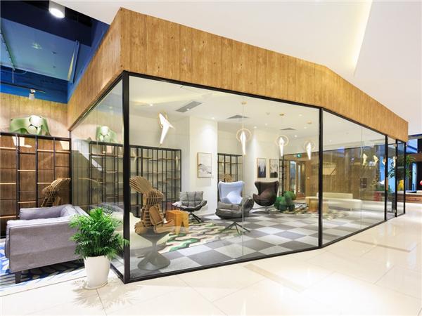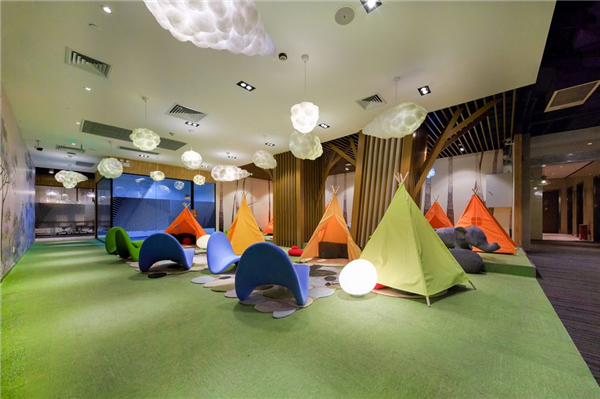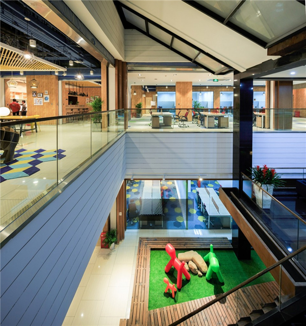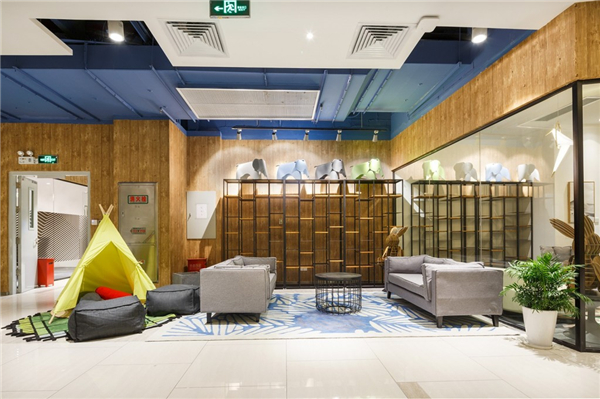 活力空间带中的公共空间节点包括:入口企业展示区、周末超市、艺术长廊、公共休息区、淘吧绘本馆、水吧咖啡区、沙龙活动路演区、酒吧等,和如游乐场一样的办公空间。