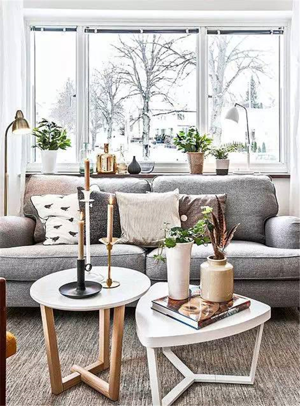 在确定茶几与沙发扶手椅搭调的情况下,如果没有适合的尺寸,不妨几张小茶几组合,协调中又能够有混搭变化。如果想在茶几上工作或拿东西更方便,还可以同款/相似款高低组合。