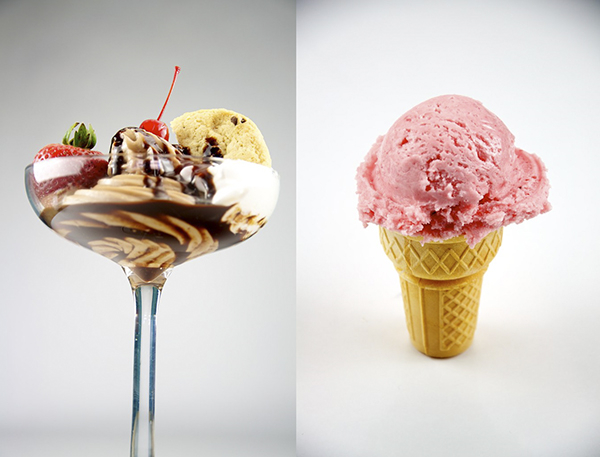 左图为,水晶杯里的冰激凌;右图为,蛋筒里的冰激凌。