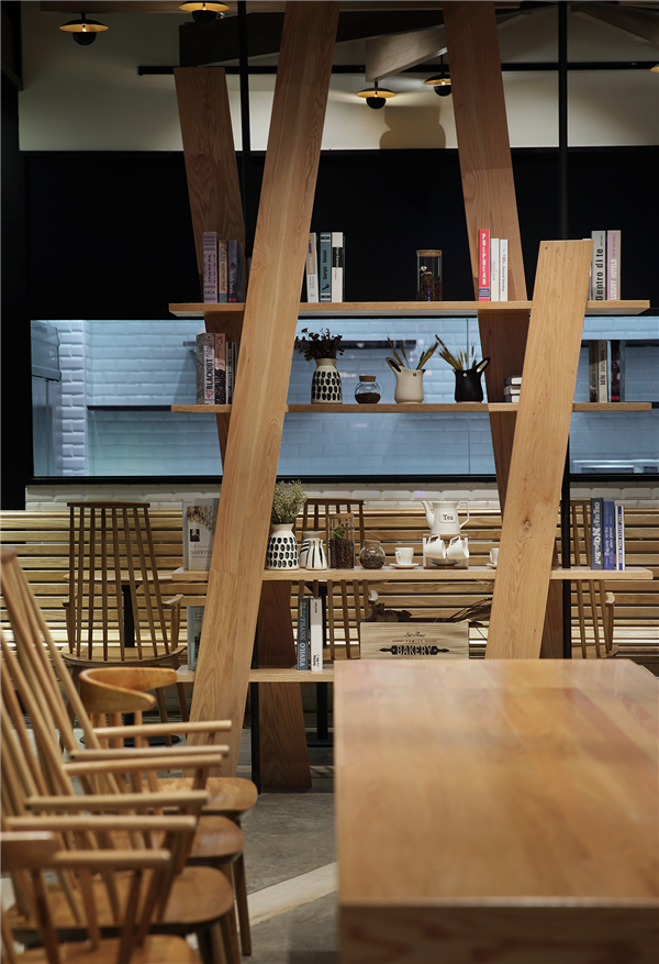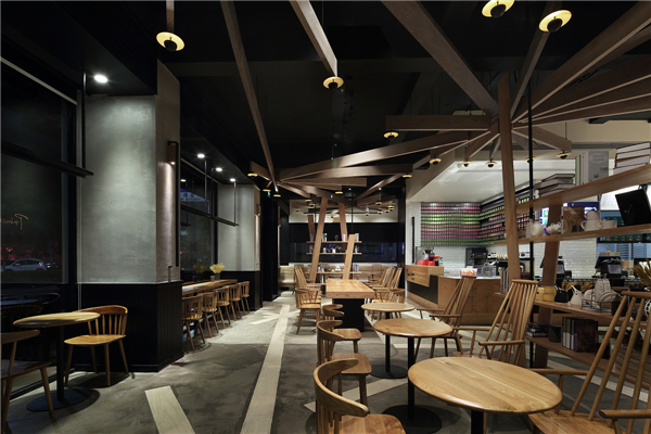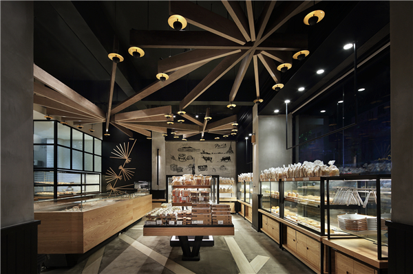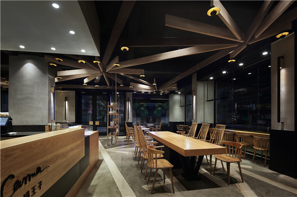 本案门头外观以及空间内部天花的发散式灯具均是一捆捆“麦穗”“麦秆”意象简化、创新、重组的结果,清新的麦穗意象与质朴的原木具象达成共识,以特别吸引目光的外表成为空间主角,它攀附在建筑外观上、悬吊于室内空间中,为整体空间嫁接上温馨的灯光,强调品牌形象的新旧相融、不断创新。