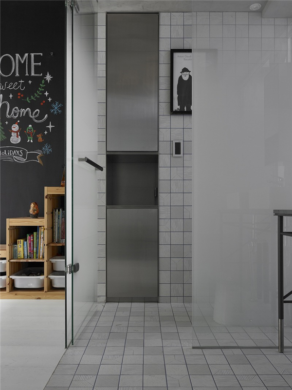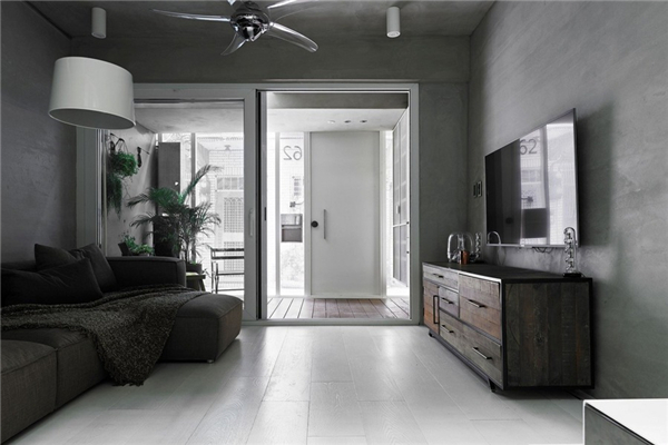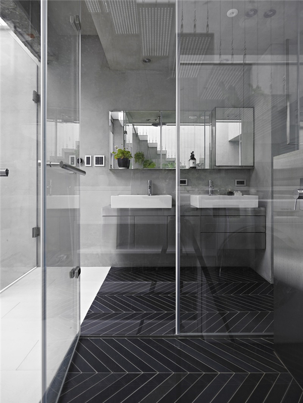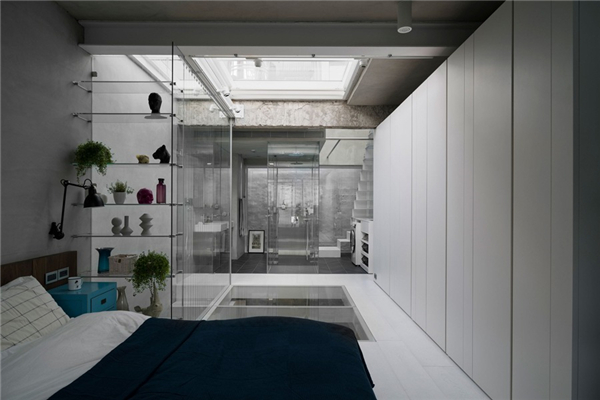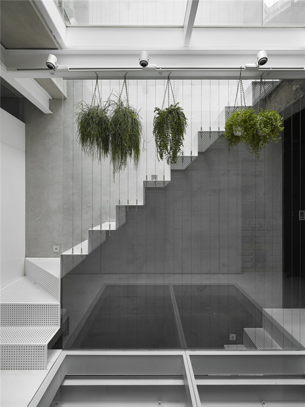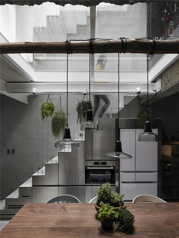光线及新鲜空气决定居住者的对空间的舒适感受,透过前后方的大面开窗及中间天井让阳光自然的流进房子的各个角落,中间天井採用玻璃保有原本楼面积,临旁的冲孔铁板楼梯让上方阳光也能穿透。另外,房屋后方原有阳台也退缩舍弃,让原本与后面房屋相临40公分的距离能够拓宽至90,并将配置在后方的厕所以玻璃作为隔间,争取最多的自然光进入。