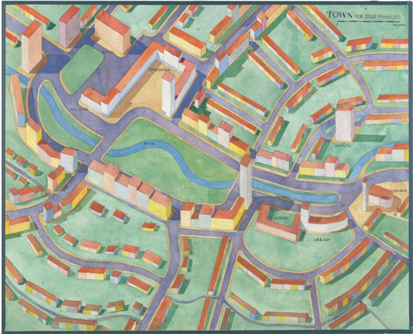 ▲约瑟夫·弗兰克1950年作品。可容纳2000家庭的城镇,鸟瞰图。