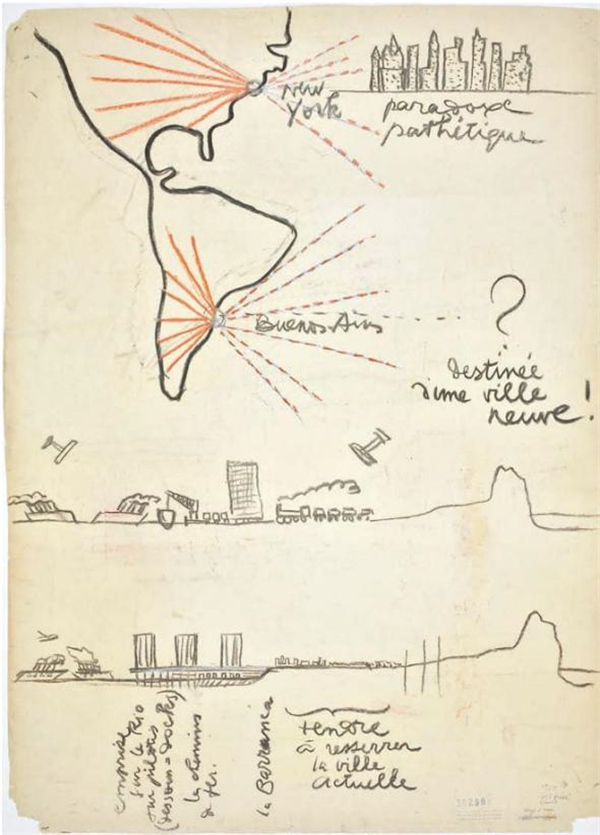 ▲勒·柯布西耶在这幅1929年所作的演讲示意图中勾勒出他眼中的布宜诺斯艾利斯,其中有藏于地下的交通网。