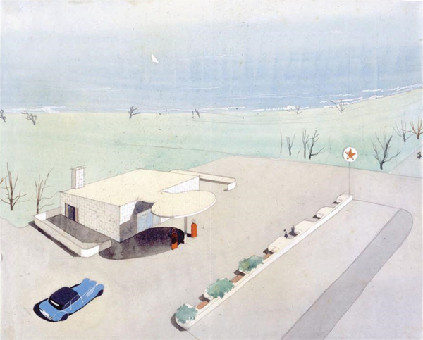 ▲阿纳·雅各布森1936年的作品,哥本哈根的一家德士古公司加油站,使用了钢笔、水彩和水粉。这座加油站今天仍在使用,并被视为现代派建筑的代表作。