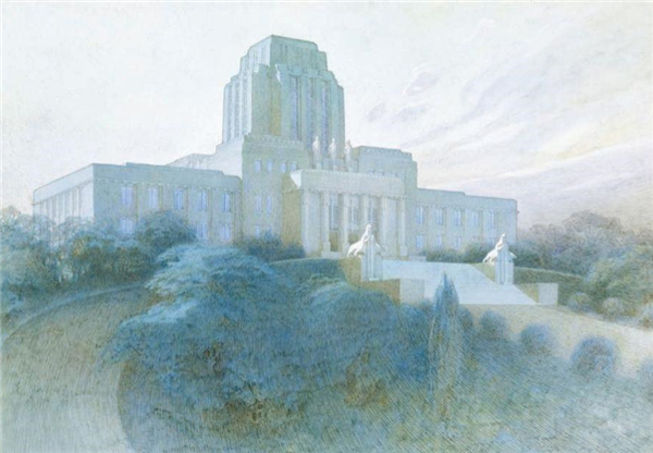 ▲伊里尔·沙里宁为赫尔辛基议会大厦创作的获奖作品,1908年作,使用了钢笔、水粉和水彩。人们常常认为是其巅峰之作,却从未付诸施工。