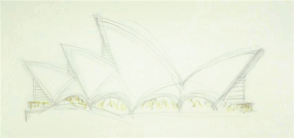 ▲丹麦建筑师约翰·伍重为悉尼歌剧院作的初步草图,1960年作,以钢笔和彩色蜡笔在透写纸上绘制而成。