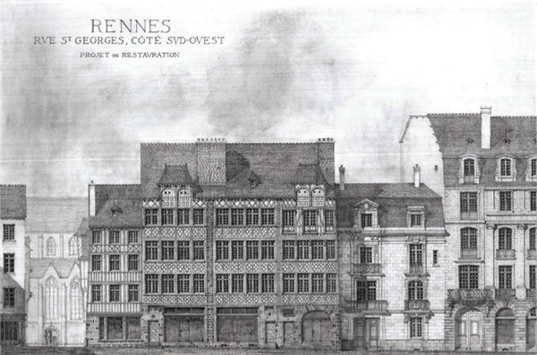 ▲法国建筑师雷蒙德·孔农1965年作品,于法国雷恩复建的一座砖木结构建筑。铅笔素描,笔触极其精确,风格高度写实。