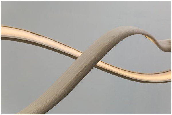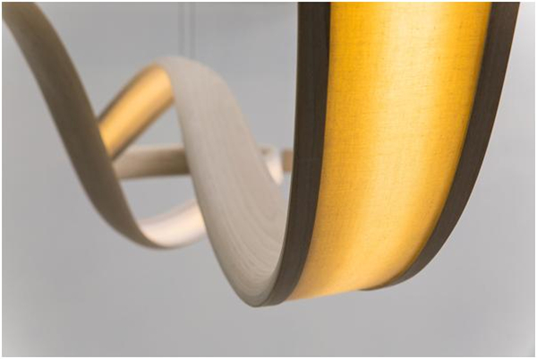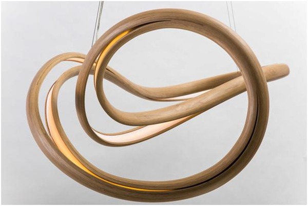设计师采用的是蒸汽弯曲法,先将木头放到一个蒸汽盒子中,用蒸汽蒸腾,可以使木头内部的纤维柔韧性更强;接着,设计者就把木条拧到一起,然后抛光,形成吊灯的形状。