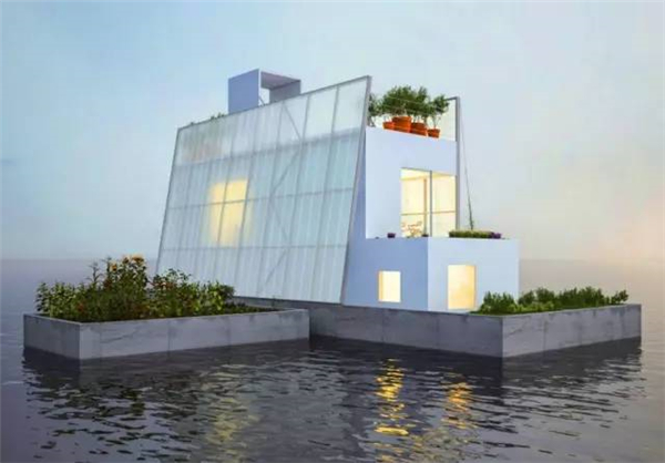 英国东海岸线在过去1万年消退了20公里,当前消退的速度为平均每年两米,人们已经认真考虑在水上生活的问题。由CTA设计的漂浮屋很有意思,它的结构轻巧,可以自由地漂浮在水面之上,就像一座船屋一样。漂浮屋内部采用了绝缘的木材,整体面积大约14米长、4.5米宽,自带花园,底部和顶部都可以种植绿植。