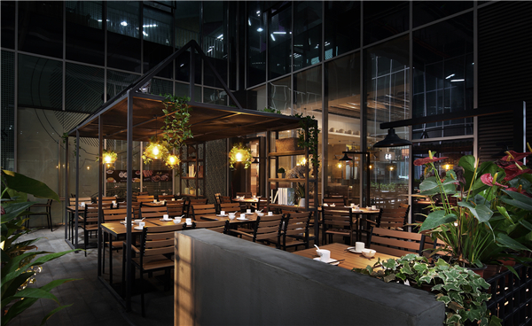 基于这个想法,设计师结合建筑本身的四面落地窗,通透的光线感为深色系空间注入一丝活力,从木质边框细节、皮质卡座细节到灯具绿植的搭配,使餐座间明确分区又不至过于突兀,所有元素将该空间打造成舒适自在的餐厅。