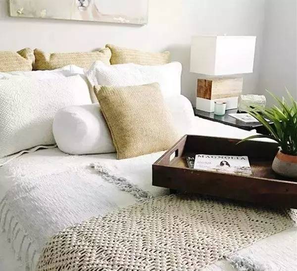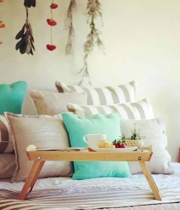 当服务员送餐的时候,可以把餐品放在床尾巾上,不用下床都可以吃东西,简直就是懒人神器。在自己家的时候,也可以在上面放书和其他小玩意。