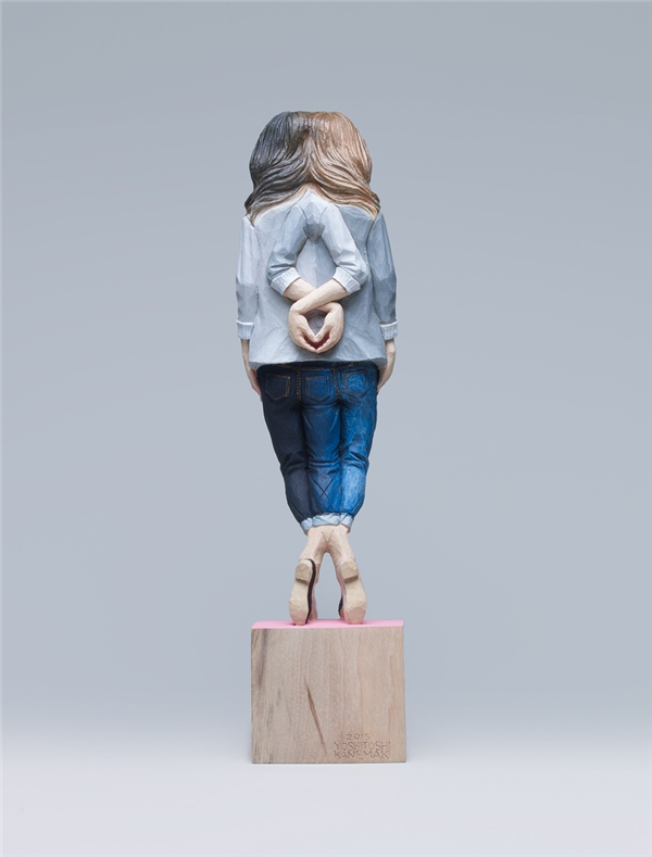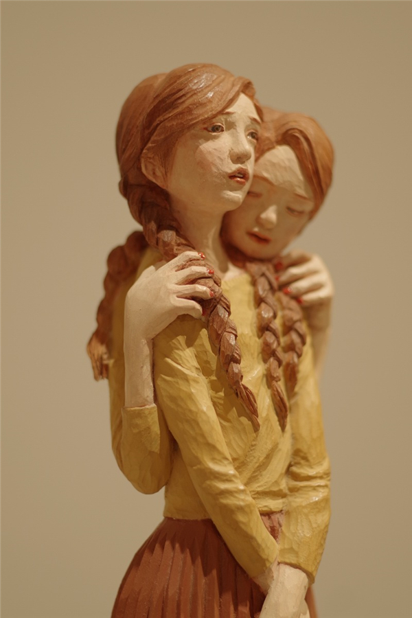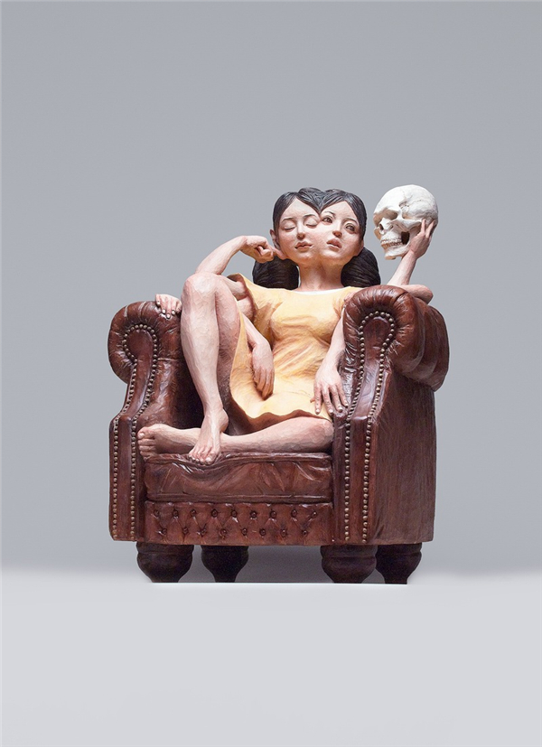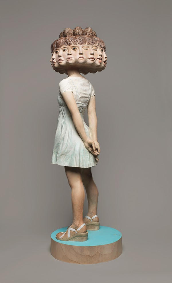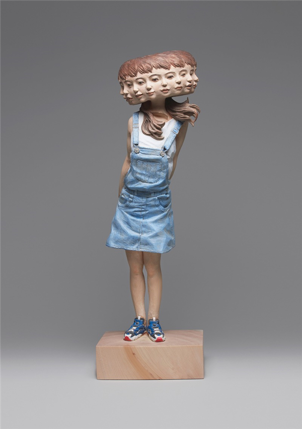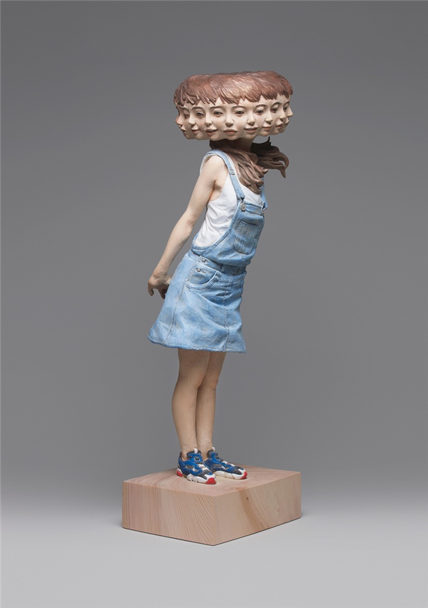 其作品试图阐释:一种事物本身相互矛盾对立的两面性是很难融合的,就连一个人的“自我”也是如此。于是我们看到了这些有些吓人的木雕作品。她们有着看似普通人的外貌,却出现了多个头或身体局部且共同融合在一起。这些头上的表情大多各异,却又不得不纠缠在一起,矛盾又统一。