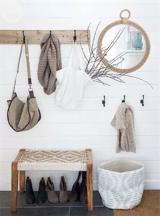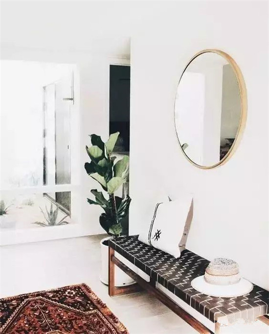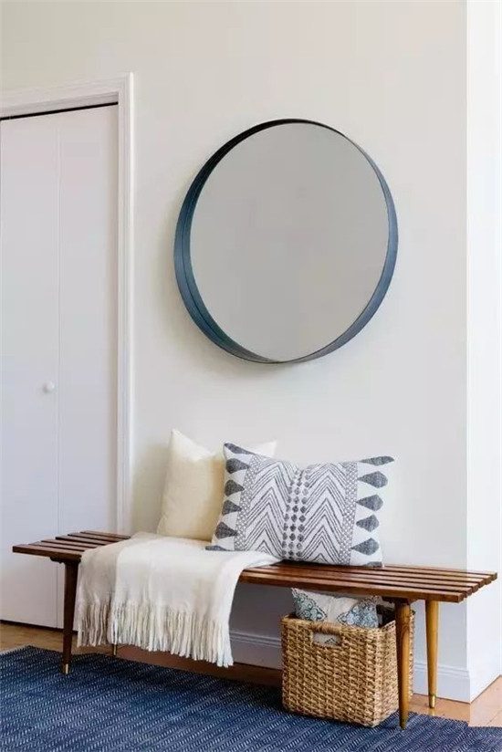 圆润的壁挂镜和窄窄的长凳简直就是玄关必备,坐在长凳上换鞋,起身对着圆镜给自己一个自信的微笑。玄关处用它俩装饰,再放些小摆件、绿植或抱枕,分分钟营造出温馨舒适的感觉。