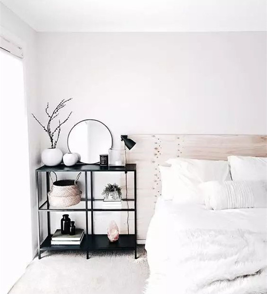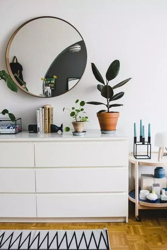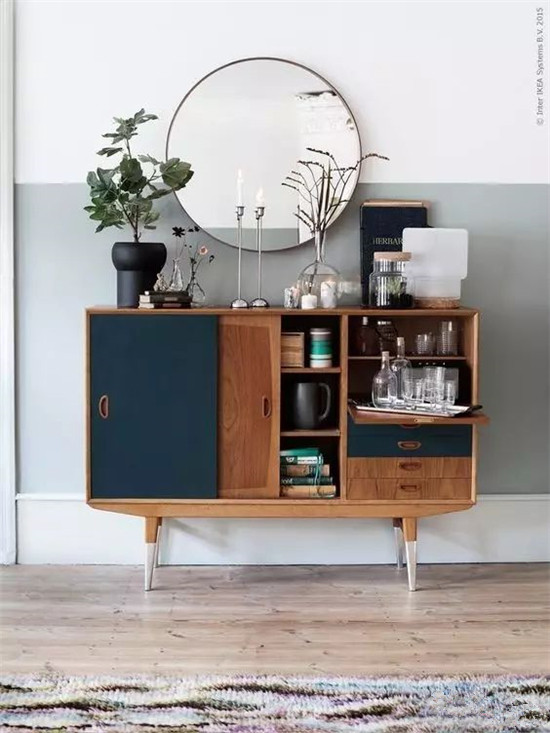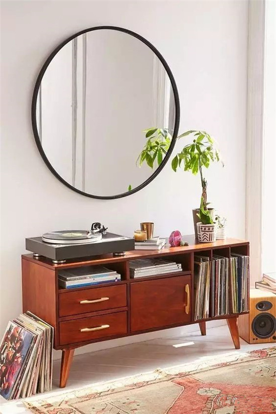 它和边柜简直就是天造地设的一对,中底边柜的上方墙面单调,一般采取挂画,宅sir建议可以用壁挂镜,视觉上会更显生活气息,没有压迫感。
