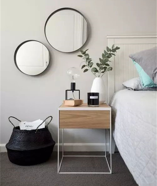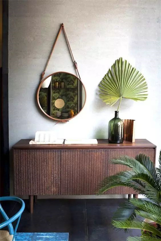 简单没有装饰的圆镜你如果不喜欢,可以挑些编织壁挂镜,它质朴的质感和木质家具特别搭;还可以用悬挂式圆镜,它可是当下最流行的圆镜之一。