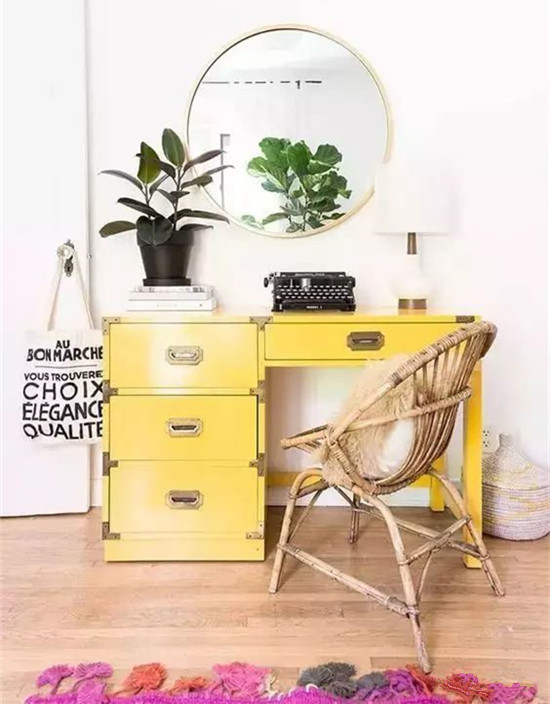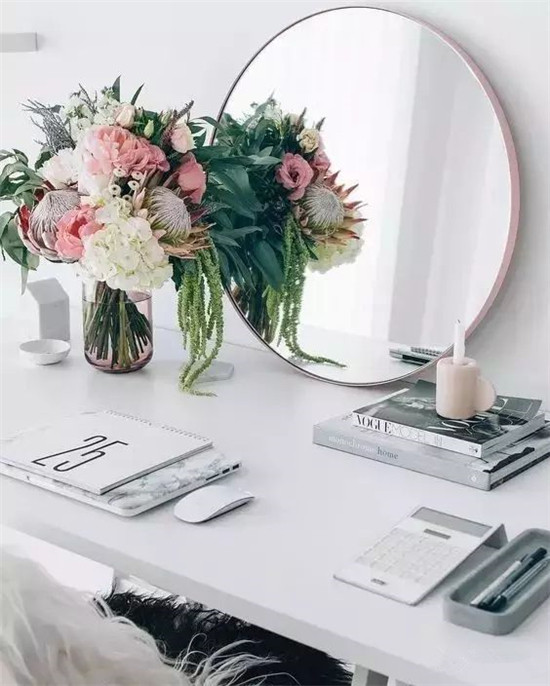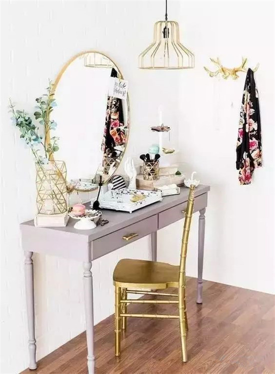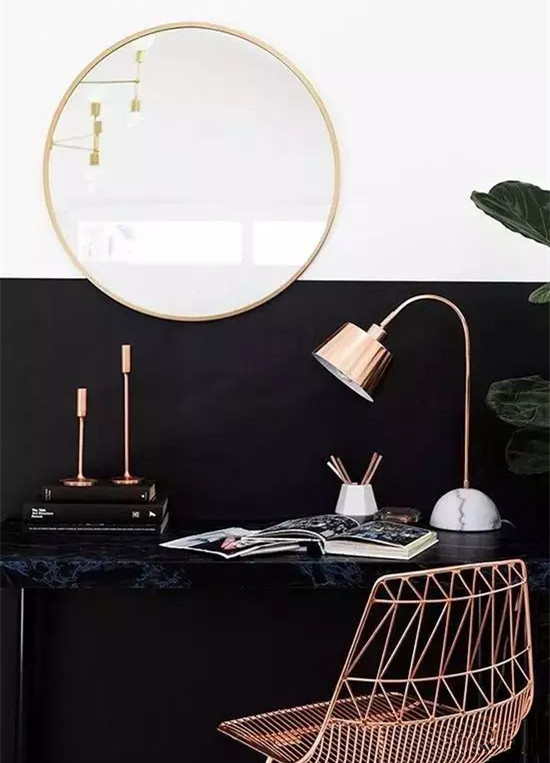 无论是工作间的写字台,还是女生的化妆台...都需要添置一面圆镜;镜子边框可以选择材质与周围的环境相呼应,一款金色黄铜边框质感高级,与椅子及桌面的小物呼应。