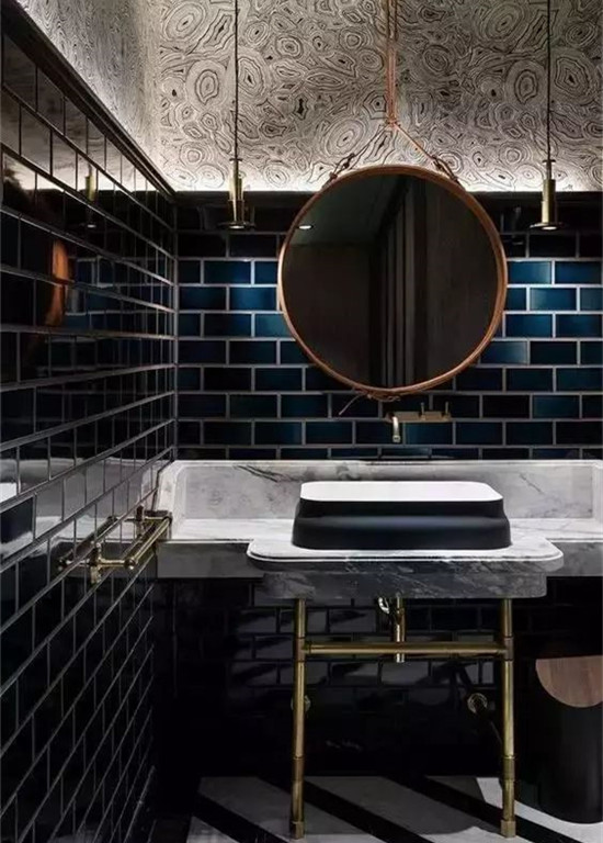 颜色花纹漂亮的瓷砖打底,放置木质边框的圆镜,实用美观。