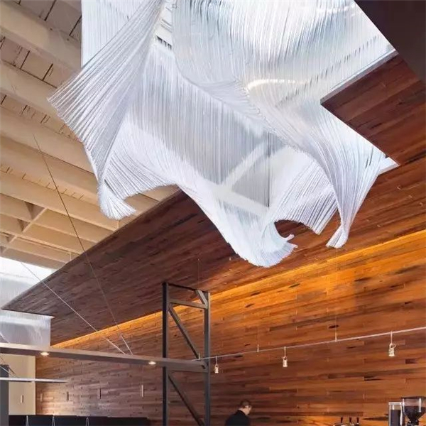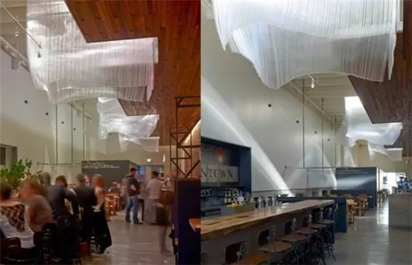 旧金山酒吧中这些炫酷的玻璃纤维雕塑是Nikolas的代表作之一,这些雕塑让酒吧非同凡响。精美的雕塑垂落下来,仿佛随风而拂,动感十足,彷佛是随风飘动的裙摆。给室内空间带来了别样的亲密感,同时与粗糙的木板天花形成强烈的对比。