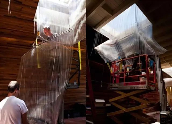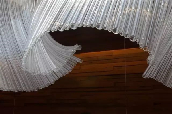 当然它的制作工序也是相当繁琐的,这个以玻璃为载体的一种艺术装置,在切、磨、抛光、窑铸、弯曲、烧制等机具加工和蚀刻的各种流程下,逐一安置在统一固定件中,由工人安置在选定的位置。