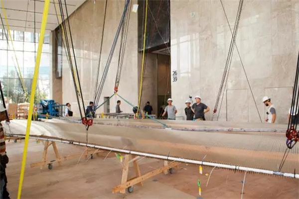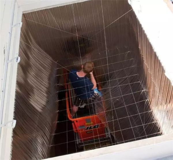 大的也是复杂的,这种安装的索具是一个疯狂的绳索,电缆和滑轮,在吊顶板和天花板上的连接之间交叉。像国际象棋一样,这个交织的系统特别具有挑战性,因为人们不得不预测如何早期的行动会影响随后的空中移动性,因为大厅慢慢地充斥着几乎看不见的暂停网络。在四十英尺的空中......花了一个小时穿过你几乎看不到的电缆线。