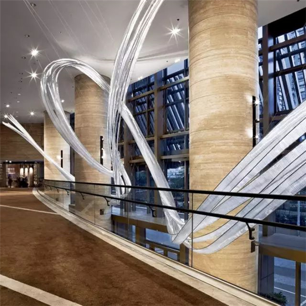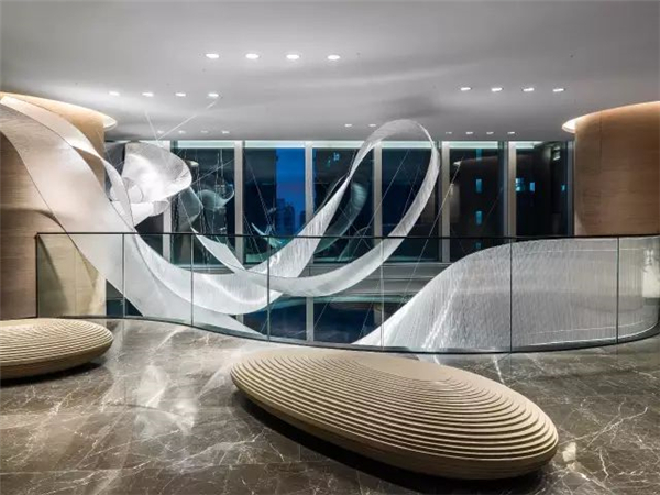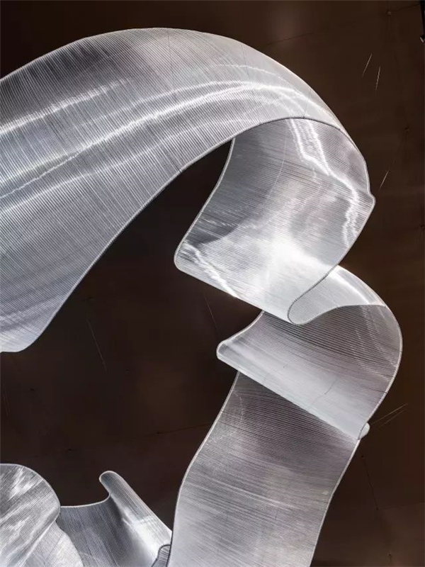 雕塑的每个管有相同的曲线,极为巧妙的利用了窄而高的空间,同时又和其它要素形成充满张力的关系。有条形组成块状为客人营造出曼妙的漫步感。