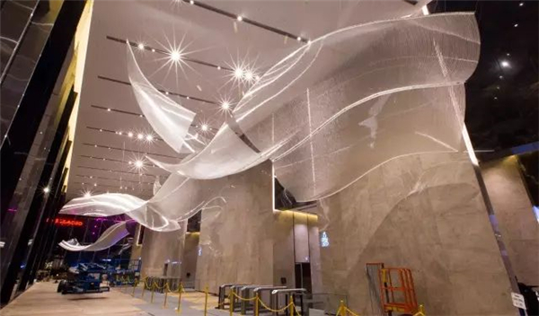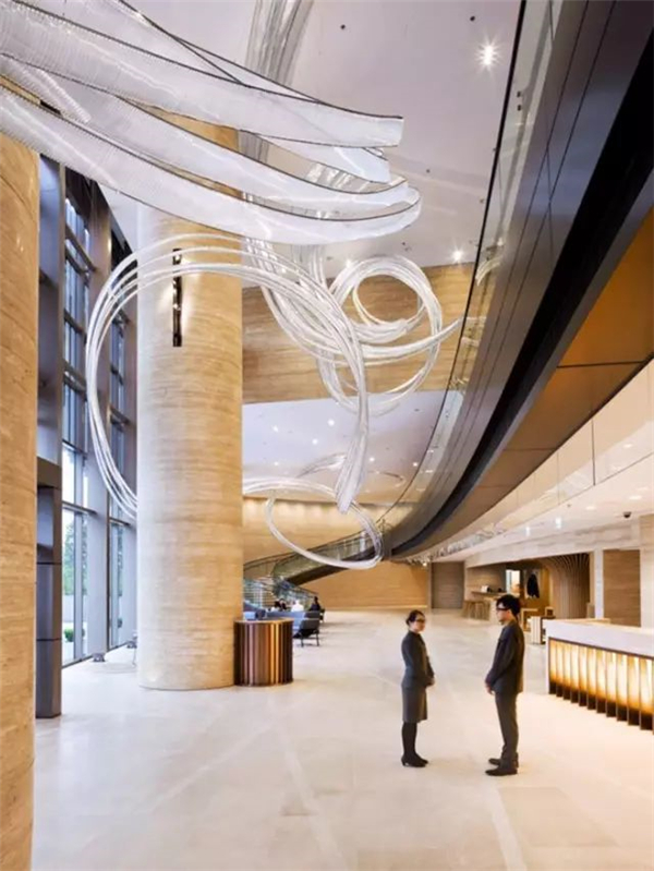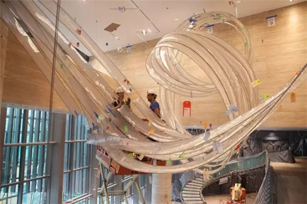 造型动感流转的雕塑由58775个小柔性硅硼玻璃组成,长达200英尺,极为巧妙的利用了大厅窄而高的空间,同时又和其它要素形成充满张力的关系。