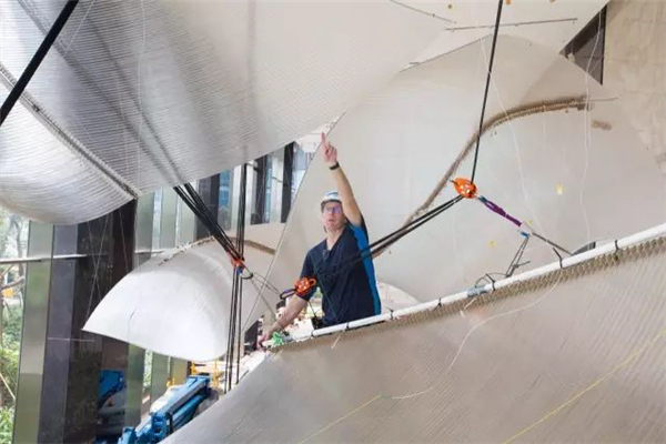在巨大的同时也很复杂,纵横交错的面板及其之间的联系复杂而又紧密,让它看起来既富有质感又十分坚固。整个玻璃制品必须在安装的同时吊装,漂浮在雅加达首府办公楼的大堂。