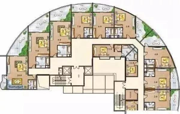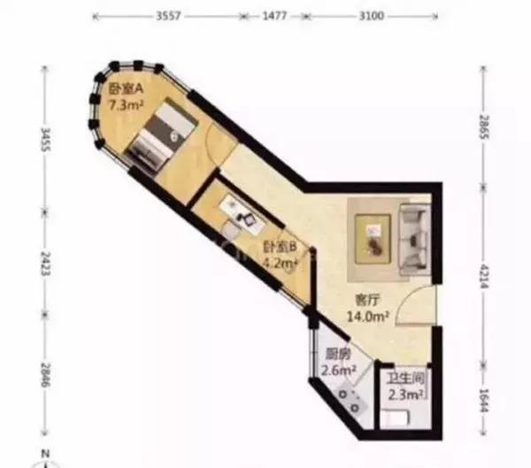 形状简直神似 bra ,这样的户型简直让人羞羞脸啊!好处就是如果半圆形的位置正好是坐北朝南,那采光应该是不成问题!