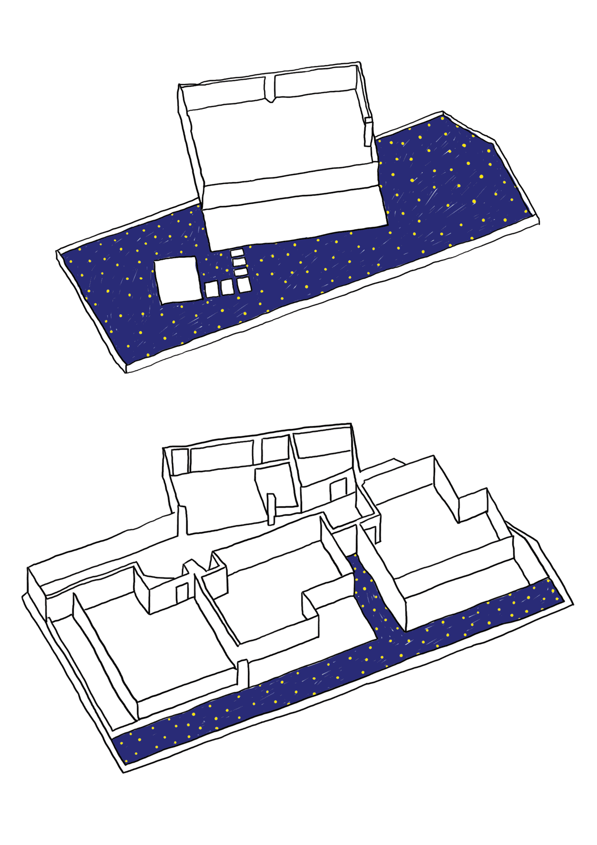 望山——面向正南面的远山,设计有内河,可以在两面环水的半开放平台遥望远山。材质选用与山石主题相配的黑灰色和自然石材。