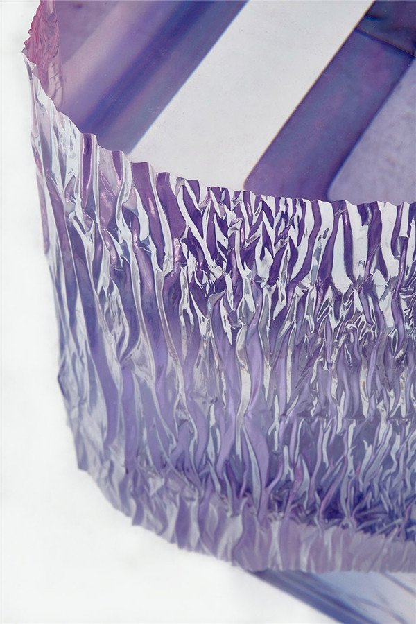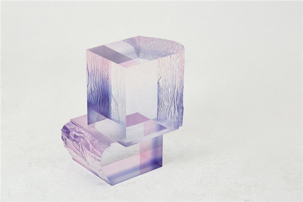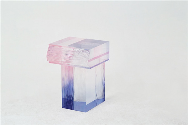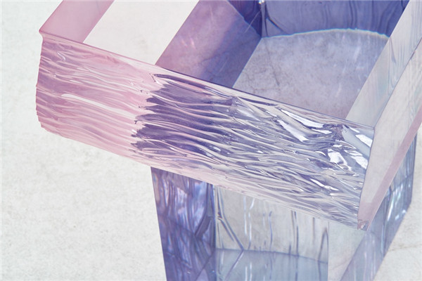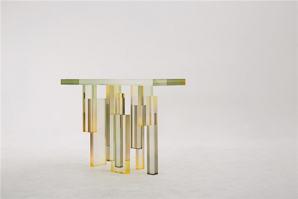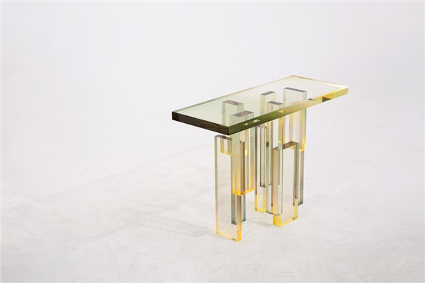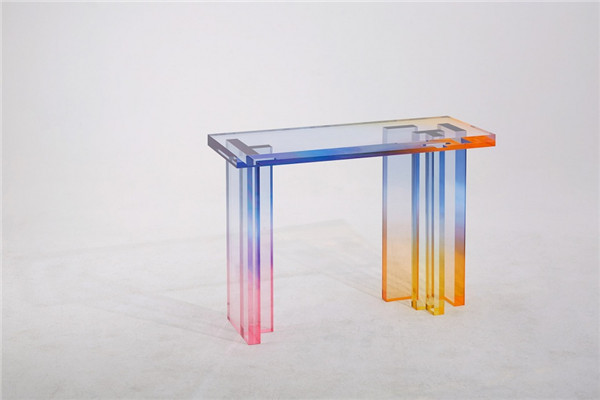 设计尝试用亚克力来表现天空的空间感,这种材料的透明度比玻璃更高。为了保持亚克力的透明度,设计师采用了纺织品染色的技术,将天空的颜色自然地融合在一起。借此,亚克力之间形成了一种视觉幻象。由于光线在透明表面上的折射和反射,这一系列作品在不同视角下会呈现出不同的样貌,其颜色也会以不同方式混合变化。 水晶桌