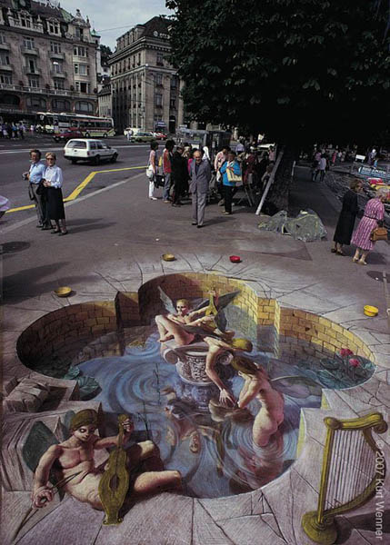 街头艺术,顾名思义,即使在街头巷尾展示的一种艺术形式。主要包括街头涂鸦艺术以及街头行为艺术。在国外的街头,有一些艺术爱好者会把自己装扮成雕像,摆出各种姿势,在游客的注视下静静的站立着,还有的会在地面上创作~而他们所需的只是一盒粉笔和每个人的目光~那些地上的画作充满了立体感,给人们一种在视觉上的震撼。这些人的创作往往让人看不出真或假。
