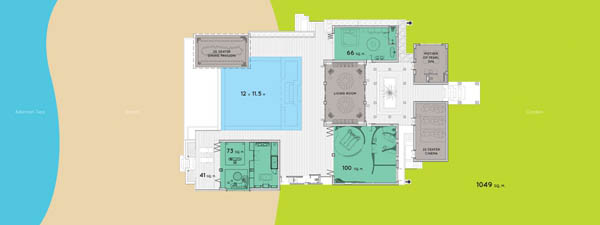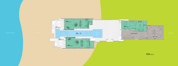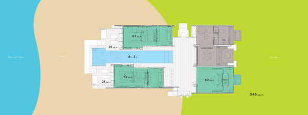 这栋综合楼里有10间卧室,分别位于四个独立的宾馆里。 别墅酒店“比安卡”和“暹罗”以及再大点的阁楼,都采用的弧形屋顶,都由两栋相互对望的阁楼组成。“珍藏版别墅”和传统的泰国建筑不一样,屋檐很深伸出很长,屋檐外部全部是木制材料。所有房屋都朝向海滩,带有游泳池,室外空间很开阔。