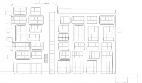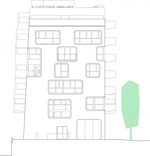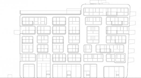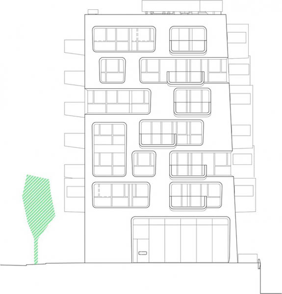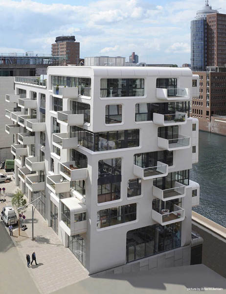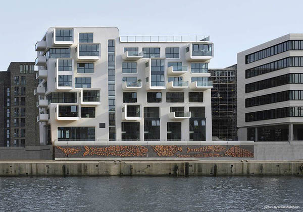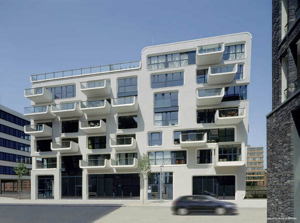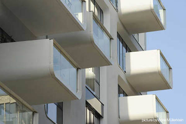 从外面看,公寓楼是一个由多个稍微倾斜的立方体组成的闪闪发光的白色结构,上面设置了稍微倾斜的大尺度开窗。这些窗洞的设置与其后的公寓布局十分匹配。每一个公寓都有一个阳台和/或凸出于建筑的凸窗。在排列紧密的建筑中,这样的设置方式能在理想方向上获得最大的视野,也就是朝向海港的视野。